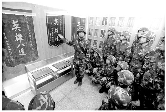八连有一个传承了50多年的好传统,就是每年新兵下连、官兵调入和主官调整时,第一堂教育课先学连史,第一首歌先唱连歌《英雄的连队英雄的兵》,第一张照片先与连旗合影,让革命英雄主义精神薪火传承,激励官兵不惧生死、血战到底的英雄气概。