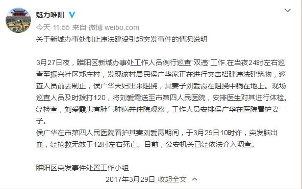 人民网北京3月30日电 河南商丘市睢阳区委外宣办官方微博今天发布《关于新城办事处制止违法建设引起突发事件的情况说明》。