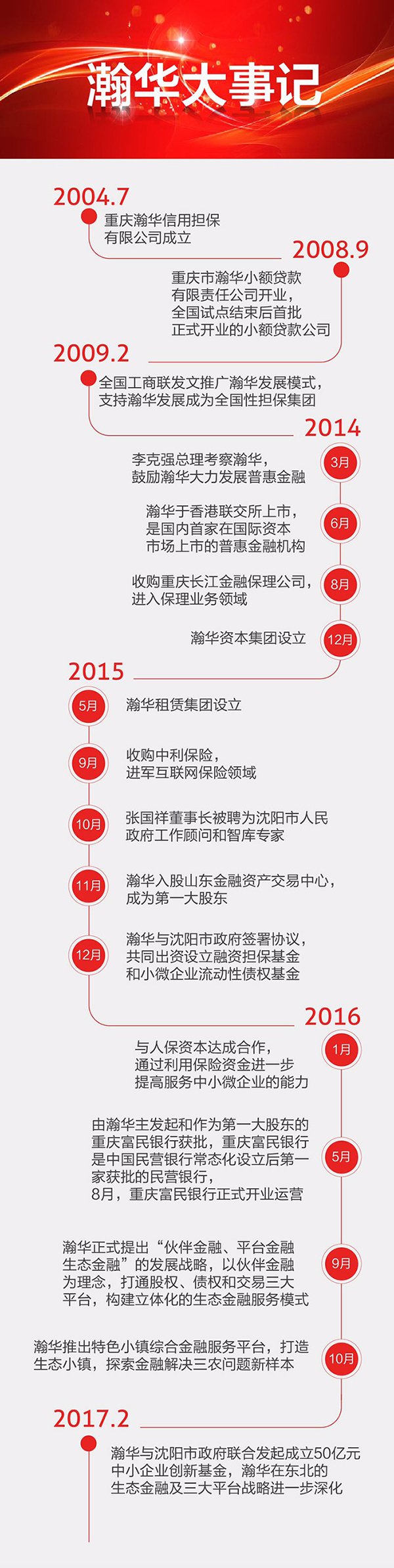 为搭建“三大平台”,2016年5月,瀚华金控主发起设立中西部第一家民营银行——重庆富民银行,并于同年8月正式开业。2016年12月,瀚华金控宣布将与香港新华汇富集团、重庆江北嘴集团在渝共同发起设立中港合资券商。2017年2月,瀚华金控宣布在沈阳携手当地政府共同发起设立50亿元规模的中小企业创新发展基金。“三大平台”已经初见雏形。