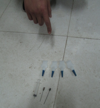 2017年3月27日,在经过大量调查走访后,民警将赵某传唤到悦来派出所接受调查,从其随身物品中搜出针管两根,注射器一只,以及四小瓶胶水(瞬间胶)。