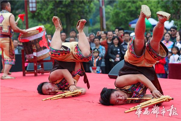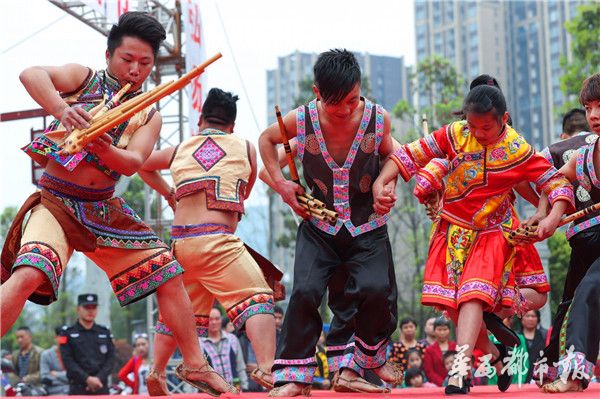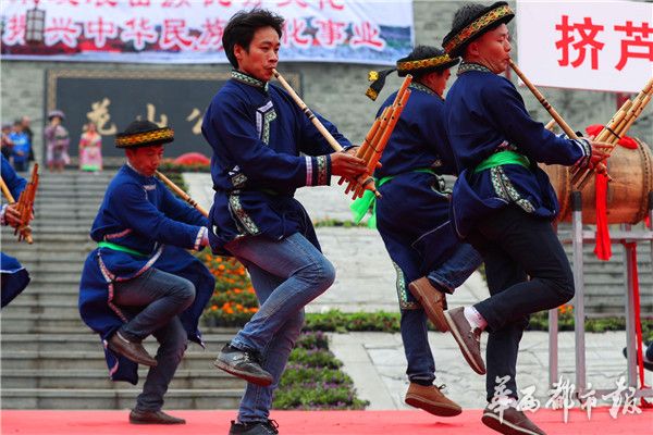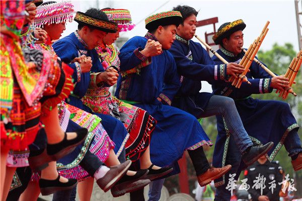 清明小长假,在四川省兴文县苗族花山节期间,来自全国各地的苗族群众在花山公园举行挤芦笙比赛。挤芦笙比赛要求完成男女分组挤、男女混合挤、山羊打架、错脚芦笙、肩肘倒立、前空翻、滚山珠等规定动作,吸引了众多观众观赏。