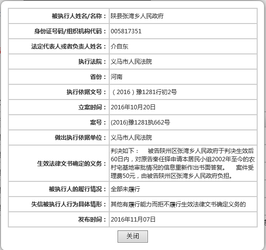 2016年4月21日,义马市法院作出判决,被告陕州区张湾乡政府于判决生效后60日内,对原告秦任铎申请本居民小组2002年至今的农村宅基地审批情况的信息重新作出书面答复。2016年10月10日,此案被立案执行,近一个月后,张湾乡政府被公布列入失信被执行人名单。
