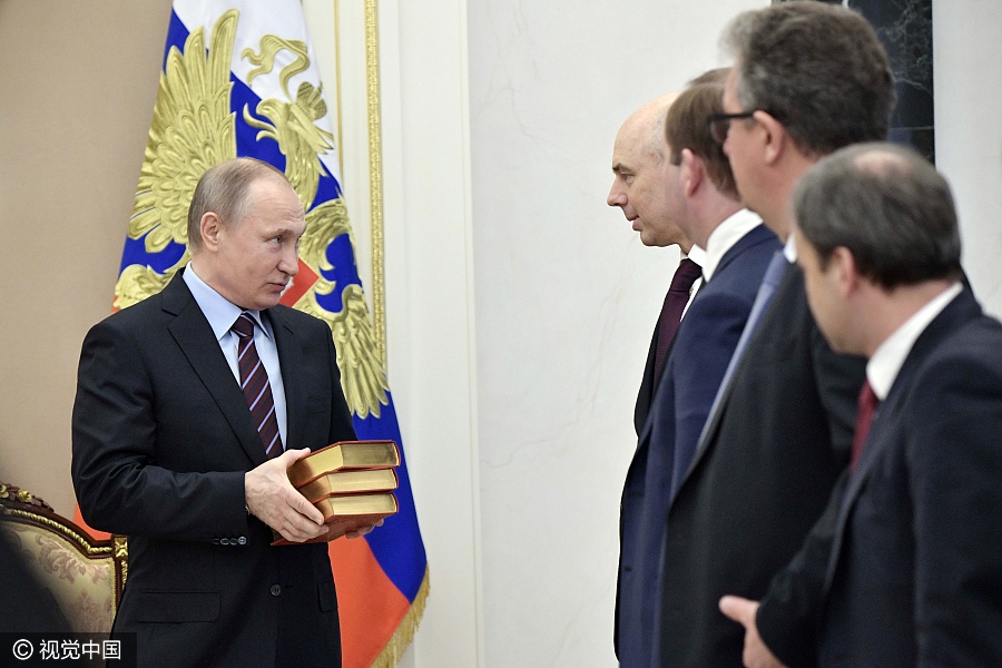 俄罗斯总统普京(左)展现“暖男”一面,向财政部长赠送生日礼物。(图片来源:视觉中国)