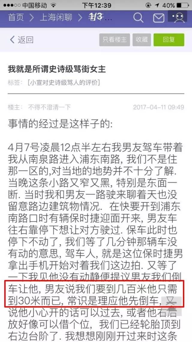 声明原文指出“男友说我们要倒几百米,他只需倒30米而已,常识是理应他先倒车”、“此时保车突然打起了大灯照我们,透过刺眼的灯光我看见车里保男拿着手机对着我们一直在拍,我很纳闷,你大灯打着一直拍几个意思?”