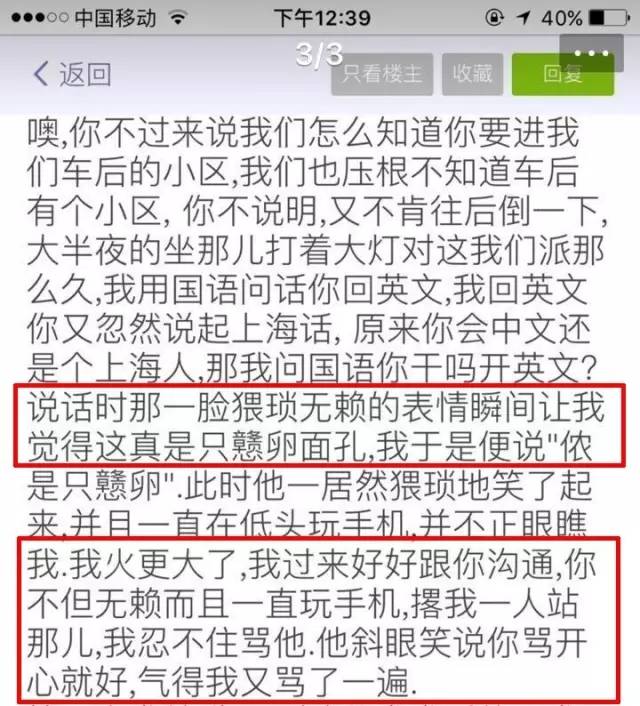 在声明中,女事主还指出,自己曾主动下车用国语问网友@TangVision “能否往后倒一下”,结果@TangVision “随即用英文一脸淡定的回答说他要回家”,而且小区入口就在女事主车后。女事主“一下懵了”,又用英文对网友@TangVision 说道:“那你应该下(车)来说呀!”没想到该男子随即用“上海话很拽的回答‘我就是不想动’”······