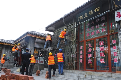昨日,西城区南新华街,工人正在拆除违建。昨日9时30分,大栅栏街道以南新华街为重点开展综合整治行动,整治内容包括拆除避风阁、治理开墙打洞等情况,对避风阁8处开墙打洞、两处整体违建进行封堵拆除。南新华街共有开墙打洞40处,5月底前将封堵完毕。 新京报记者 李飞 摄