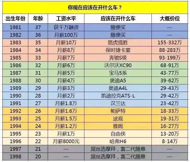 不过讲真,朋友圈里的确有85年出生却坐拥81年成就的朋友,当然大部分人想必还是跟图中的美好有着些许差距。那么今天咱就事论事,撇开这个图,聊点正经的,各年龄段的普遍人群应该买什么车?什么车更适合你?