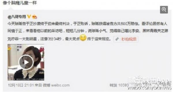 于正和琼瑶打官司败诉,王思聪转发营销号并评论:“像个脑瘫儿童一样”