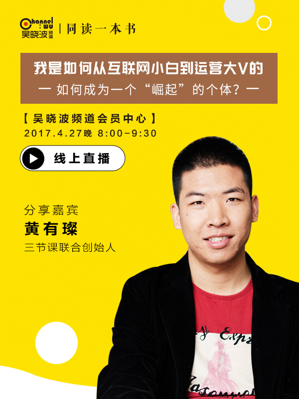 今晚8:00,他要花一个小时,为吴晓波频道的新锐会员们进行语音主题分享《我是如何从互联网小白到运营大V的》,聊聊他传奇的运营生涯,传授普通人如何成为一个超级“崛起”的个体。
