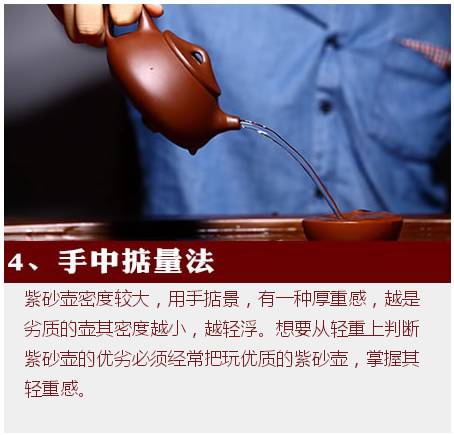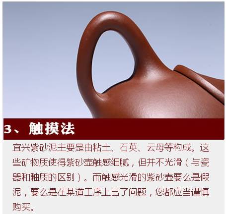 功能效用好的则质优,不然则质差;官能感受好的则质优,反之则质差。所以评价一把紫砂壶的优劣,首先是泥的优劣。紫砂与其它陶泥相比,一个显著的特点即是手感不同。一摸非紫砂的物件,就如膜玻璃质器物-粘手,而摸紫砂物件就如摸豆沙-细而不腻,十分舒服。所以评价一把紫砂壶,壶质表的手感十分重要。