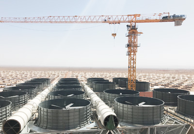 施工现场是1430公顷的荒漠地带,65万块光伏镜面装置整齐铺设,巨大的熔盐罐和集热塔分布其间。