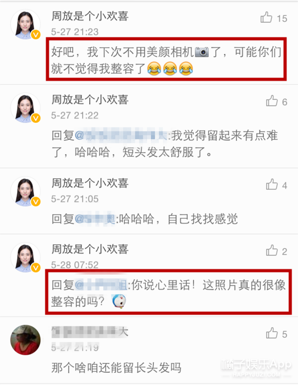 由于现在的她看起实在是美太多了,就有人说她是不是整了,周放还挺可爱的说“下次不用美颜相机了”哈哈哈。