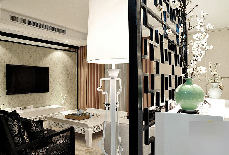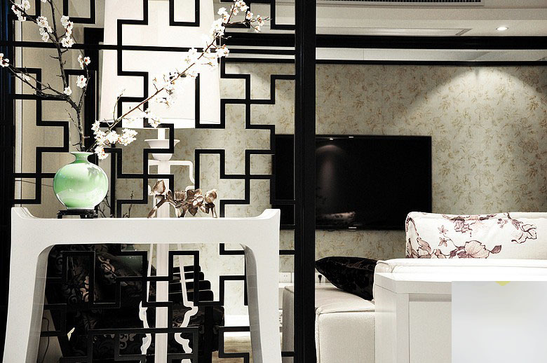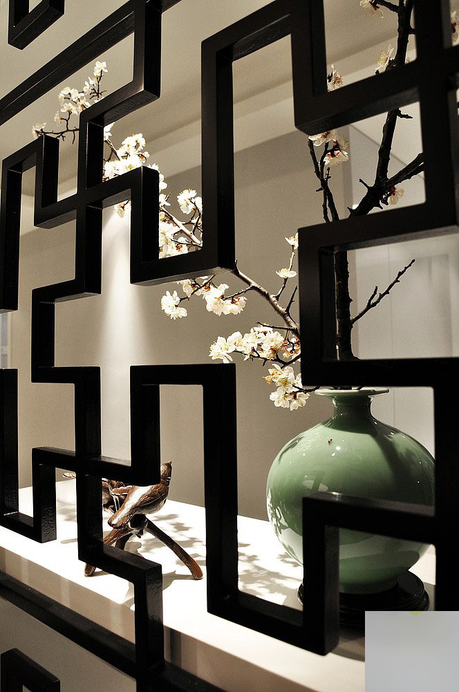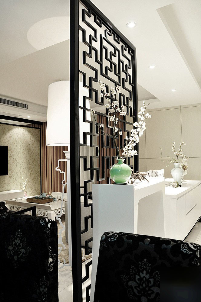 玄关里的这道黑色的屏风,搭配白色的摆台,并在上面摆着一个禅意的梅枝装在青色花瓶里,让人一开门就感受到了一股古韵的气息;