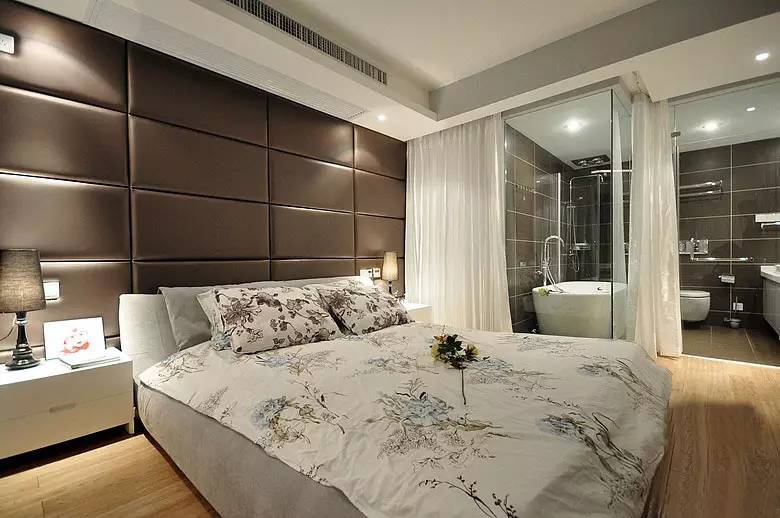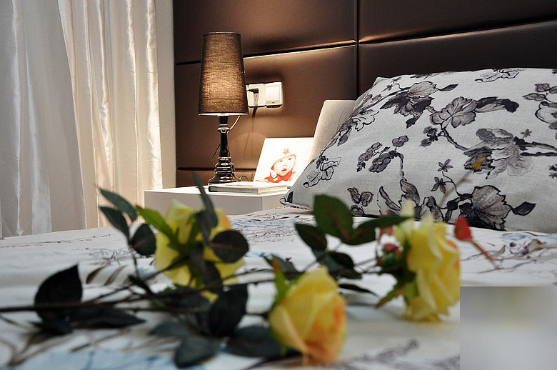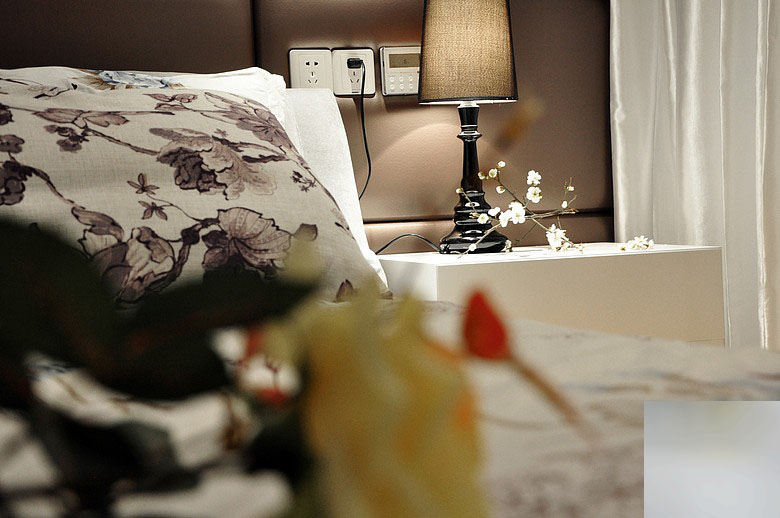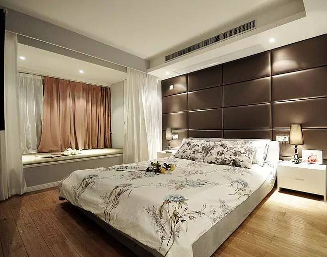 卧室的床头以棕色的皮革硬包,显得很舒适的质感;白色的床单上绣着清新的图案,搭配飘窗显得情调又舒适;