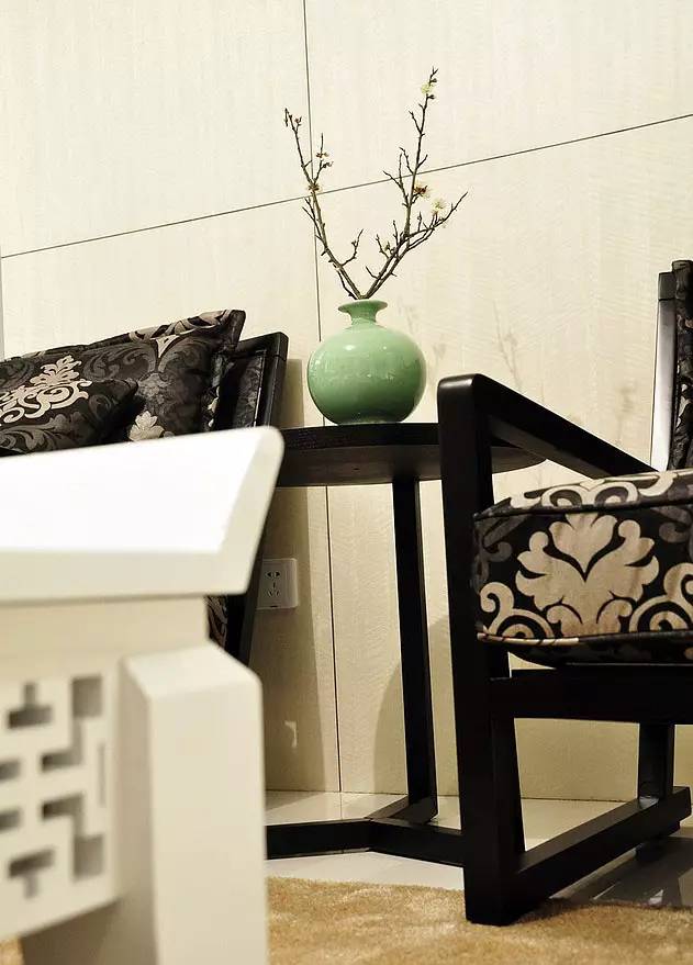 在一旁单人沙发靠着木饰板墙面,前面摆着两张黑色的单人沙发,显得格外的精致有中式味道;