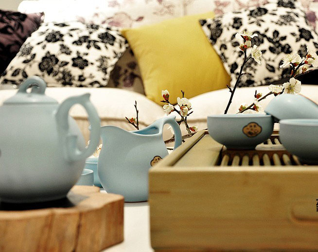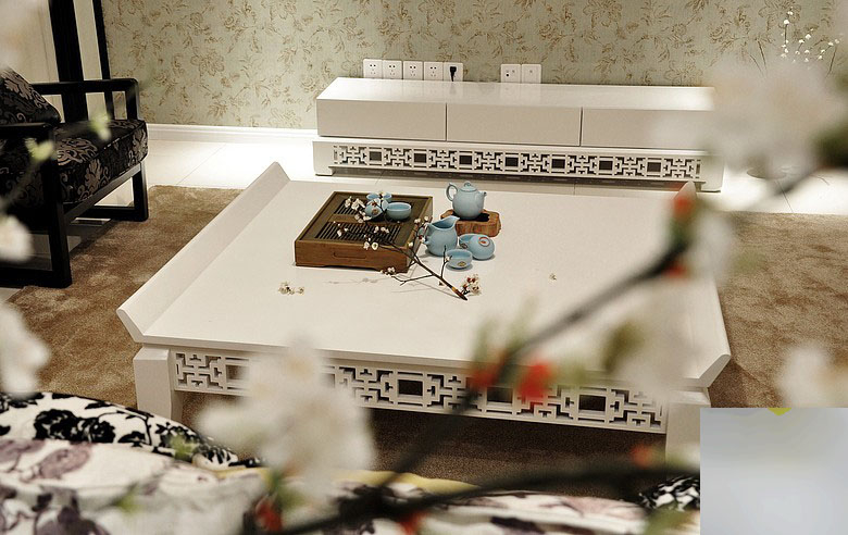 白色的中式茶几,摆设一套禅意韵味的茶具,