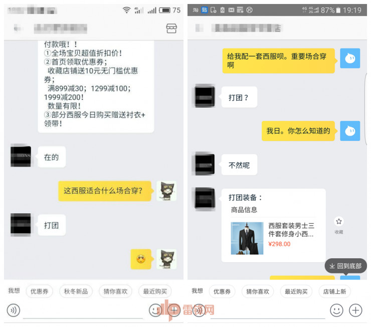 某宝客服能感受到这种“流行趋势”是有原因的。比如,不断有买家询问要“打团西装”后,客服已经能领悟到“重要场合”就是“打团”。