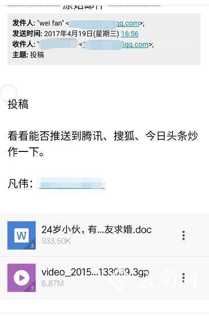 而这个叫凡伟的人还给云南网投过一篇稿件,记者查证,凡伟于2017年4月19日给云南网投了一篇稿件及视频,稿件标题叫《24岁小伙,有望站在诺奖领奖台向女友求婚》。他在投稿附言中留言称:“看看能否推送到腾讯、搜狐、今日头条炒作一下。”