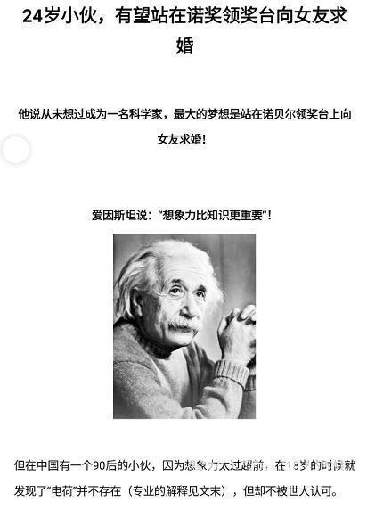 他在文中说,他说从未想过成为一名科学家,最大的梦想是站在诺贝尔领奖台上向女友求婚!在文首还附上了爱因斯坦的一句话:“想象力比知识更重要”!
