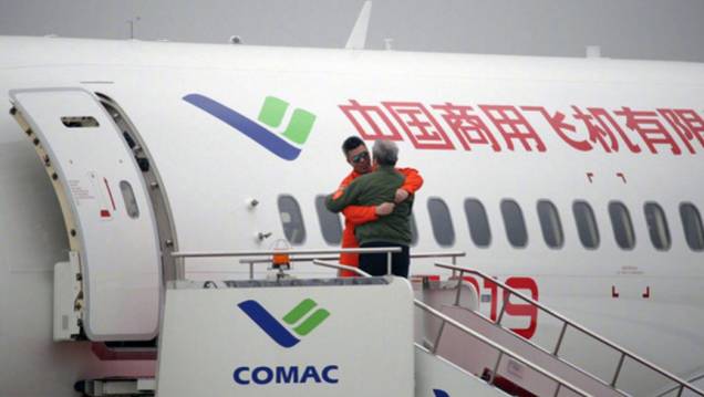 国产大飞机C919的试飞成功了。飞机降落在机场之后,驾驶员缓缓从阶梯上走下。站在底下望等着他的是这款飞机的主要设计者。