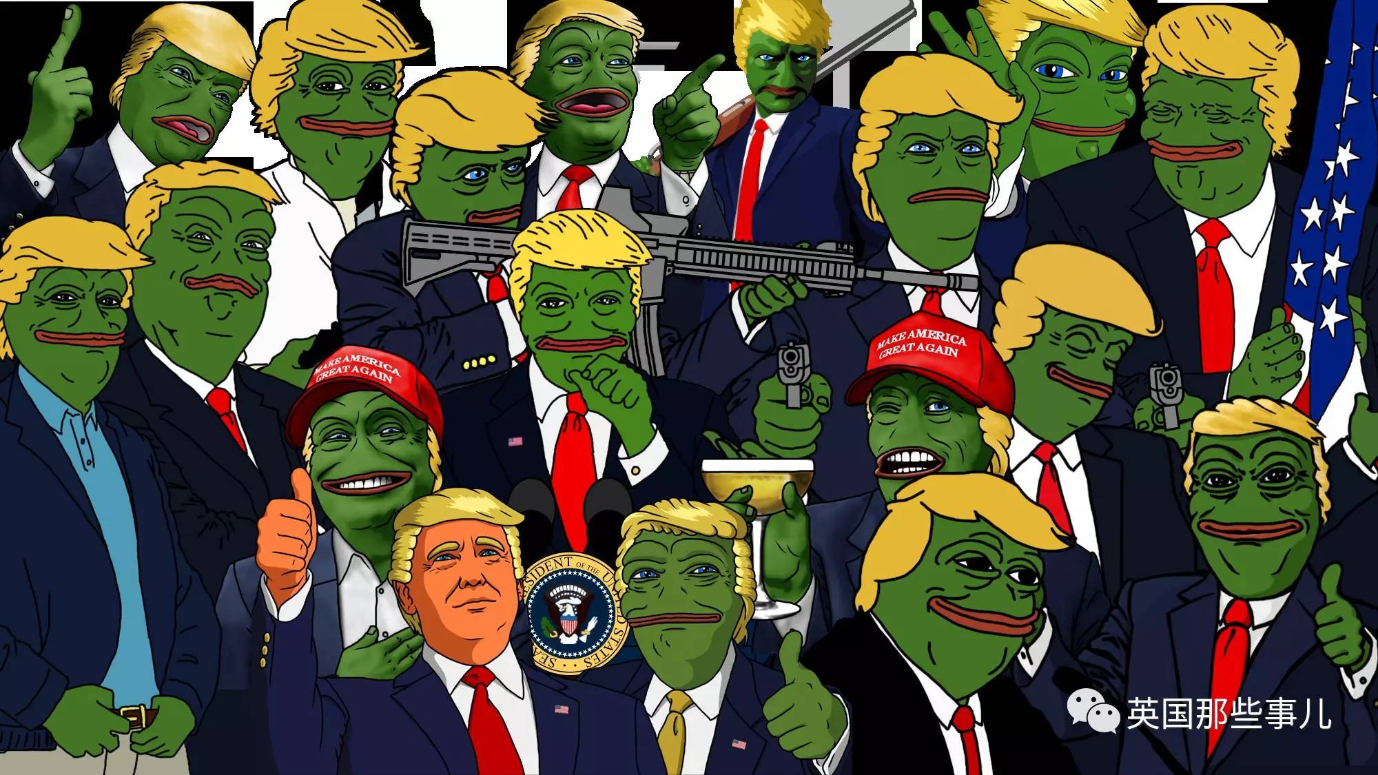 好勇猛,好英姿飒爽...同时,也再一次加强了川普和带有纳粹特色的川普蛙的关系。