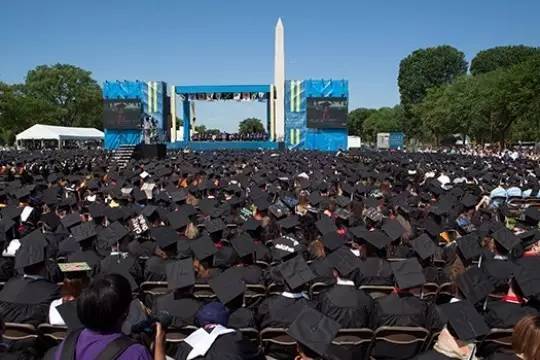 乔治华盛顿大学的毕业典礼会在国家广场的华盛顿纪念碑北侧举行,每年都有数万人参加。