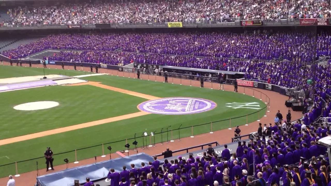 而NYU的毕业典礼每年在洋基体育场举办。典礼当日,紫色的袍子的旗子为纽约的天空增添了一笔别样的色彩。