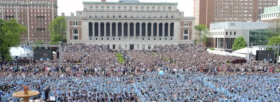 哥大的毕业典礼按传统在主校图书馆之间的大草坪上进行,蔚蓝色的礼服和礼帽汇成一片欢乐的海洋。