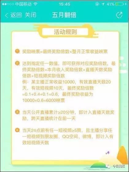 首先是映票翻倍,招募中间人阿斌给大家举了个例子说明:按照映客官方分成比例,主播(公会)提现比例为32%,但是官方每个月会给任务,完成任务过了翻倍到64%。