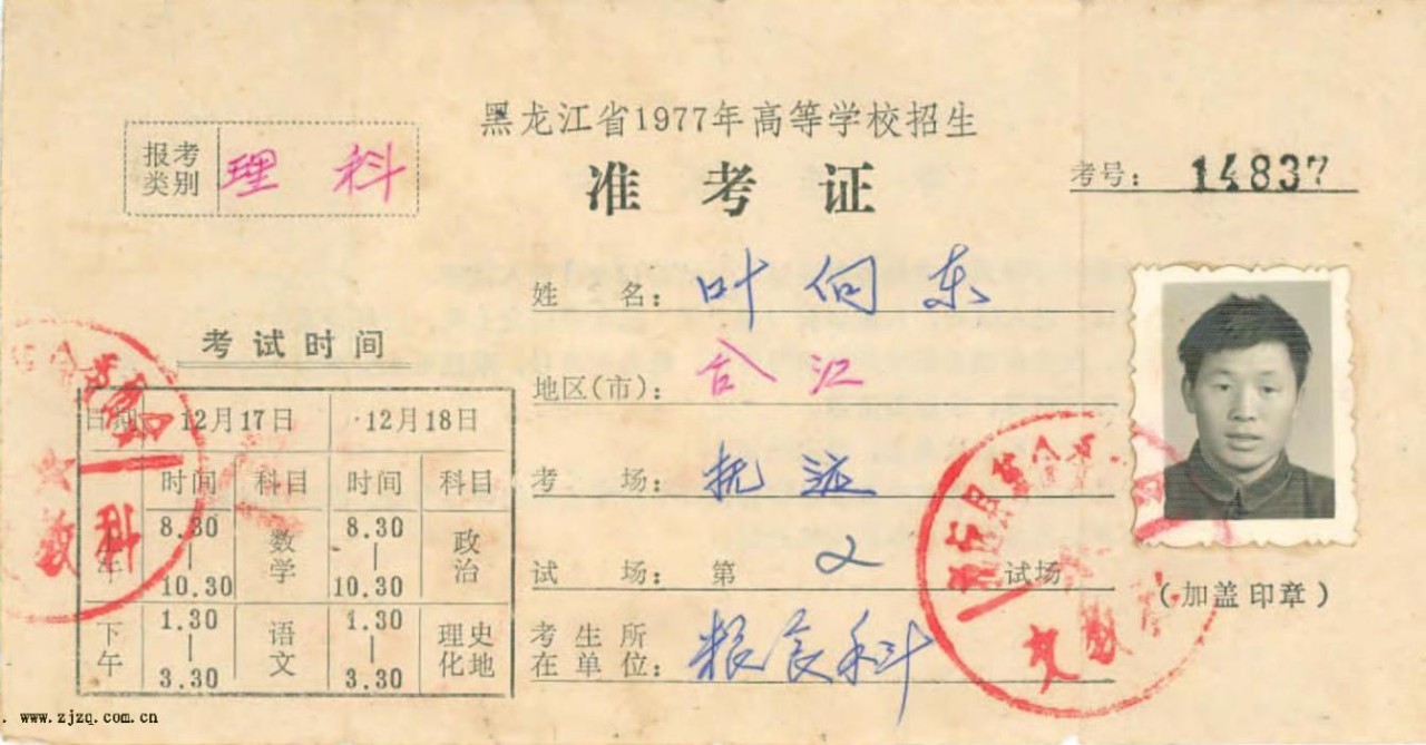 文后话:到校后得知,该年黑龙江省高考,虽然允许30多岁的六六届高中毕业生等参加,但与“平等竞争,择优录取”的录取原则有着很大差距,公平公正性大打折扣,我所在的佳木斯师范学校扩招的数学、物理、化学等五六个戴帽师专班(毕业前批准升格为师范专科学校),最低录取分数是290分(本人319分,高者350多分)。而25岁以下者,哈尔滨工业大学等全国重点大学录取分数线才270分,普通高校220分即可。尽管如此,1977年恢复的高考制度毕竟给了生活在社会最低层的知识青年一个机会和希望,其影响弥久绵长、难以磨灭。可以说,当今社会还没有哪种人才选拔制度比高考制度更公平合理!尽管高考制度也存在这样那样的问题,需要进一步完善。