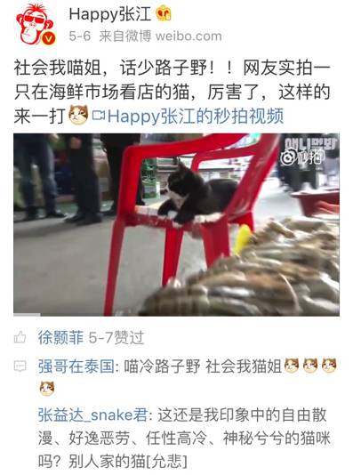 这只猫每天在海鲜市场看店,捉老鼠。其他猫咪一靠近它的领地,它就立刻张牙舞爪将对方赶走。这如同收了保护费一般的敬业态度,简直就是猫中古惑仔,所以被网友盛赞:“喵冷路子野,社会我猫姐。”