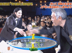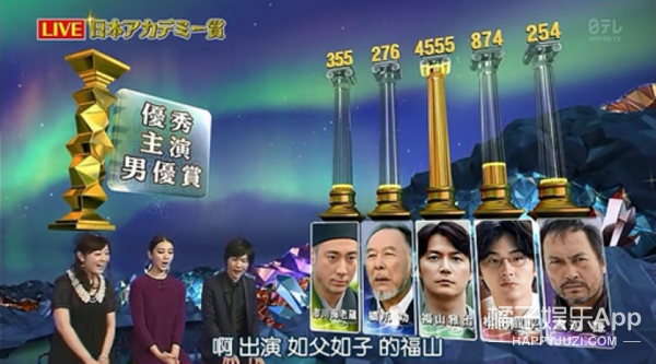 在《编舟记》的颁奖典礼上,松田龙平的观众投票数只有874,他面对的是有4555票的福山雅治。