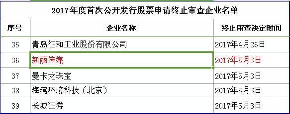 网站显示,在2017年度首次公开发行股票申请终止审查企业名单中,新丽传媒为今年第36家IPO终止审查的企业,终止审查决定的时间为今年5月3日。