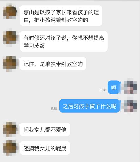 未来网记者向刘业了解到,涉事教师惠山以家长来看孩子为由,把孩子单独带到教室,问女童“爱不爱他”并摸了孩子的臀部。