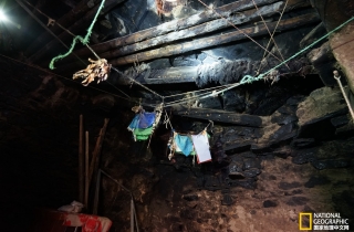 参观完底层石屋,我们又回到新屋,由楼梯上到第二层,这家人是把原来的石头房子与新建的房子衔接在一起,石头房子成了家里的储藏室。二层石屋相比底层宽敞得多,显然是人们原先居住生活的区域。村长打开手电筒带我走向靠墙根的地方,看到一个像井一样的洞口对我说:“这是通往下面房子的通道”。我这才反应过来,原来石头房子的上下层是通过竖井通道所连接的。如果不看到外观的墙壁,还真以为进了山野石窟呢。