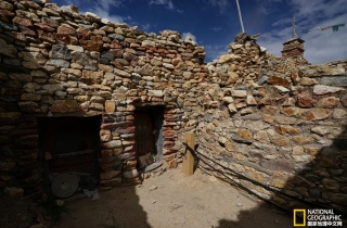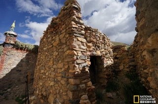 二层石屋显然经过多次修复,房顶采用石片与木料混建,但整体构造基本保持原来的形状,和卫藏传统建筑方式相似。听老人讲,这一带原来也生长树木,早年盖房子的木料都是从附近山沟里砍伐来的。二层墙壁虽比底层要整齐得多,但还是保持了原始的自然形态,墙的四角在建造时就砌成不规则的隔层,既结实也有实用性(以便摆放物品),一切都与石窟的构造很相像。看完上下石屋我忽然发现整个石头房子没有一个窗户,而且门又很小,尽管屋顶有一小小的天窗,但石屋内还是黑糊糊一片,我们要不是打着手电筒什么也看不清,真不知道那时的人们是怎么生活的,难道白天黑夜只有靠油灯或是炉火的亮光吗?还是人们本就适应洞窟里的幽暗。
