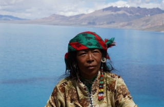 当惹雍错边织围裙的妇女