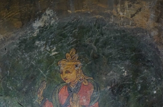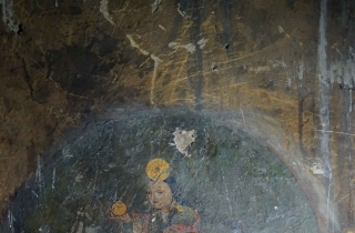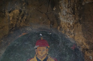 嘎桑一边打开手电筒一边对我说:“这个屋里有壁画”,墙壁上黑糊糊的,所谓的壁画只有三处,不过巴掌大小,而且分部在几个不同的地方。嘎桑用手电光指给我们:“戴红帽坐着的是象雄国王,那个女的是他的王妃,站着的一个是他的大臣”。可我看后明显感觉壁画风格并不久远,画中人物装束也是很晚,很显然与古象雄没任何关联,不过古象雄人究竟什么样谁也不知道,包括象雄的后人们,所以画中所谓的象雄王只不过是后来人的想象而已,这种现象在西藏壁画中也很常见。所以当时我并没在意,加上洞内黑暗,也没做认真细致观察。听嗄桑说这个屋子过去是村里的头人住的,从洞屋内简单的构造分析,他说的没错,这里应该是一个议事或聚会的地方。只是洞窟漆黑一团,真不知道这些壁画是怎么画出来的,这不禁让我陷入了深深的迷思之中。