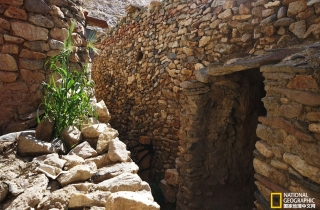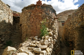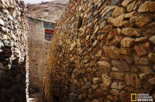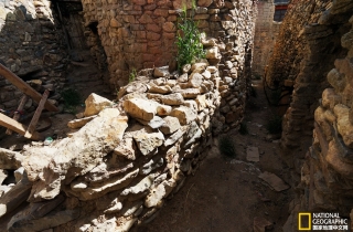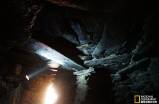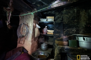 新房有两层,一层地上都堆放着麦草,显然是圈牛羊的地方,主人又带我们往里面走,只见前面出现一个黑乎乎的洞口,嘎桑打开事先准备好的手电筒,说这就是原来的石头房子。我顺着手电的光亮小心翼翼地钻了进去,里面基本呈圆形,直径大约两米,高不过两米,从下到上全是用不规则的石头砌垒,而且石头与石头之间没有任何填充物,不知道经过多少年烟熏火燎,四周石头的表层好像用油漆刷过一样,漆黑一片。接近顶部是由四个厚重的条石形成伸臂式构造,上面再用较大的片石层层覆盖,这显然是最原始的洞窟建造方式,这让我想起西藏古老的伸臂式桥梁,它们有着异曲同工的结构方式。噶桑告诉我们,听老人说这下边的一层是早年躲避战乱藏身的地方,而且还有几个洞,之间是由地道链接,我这才发现黑暗处有个非常狭窄的通道,只可一个人通过。