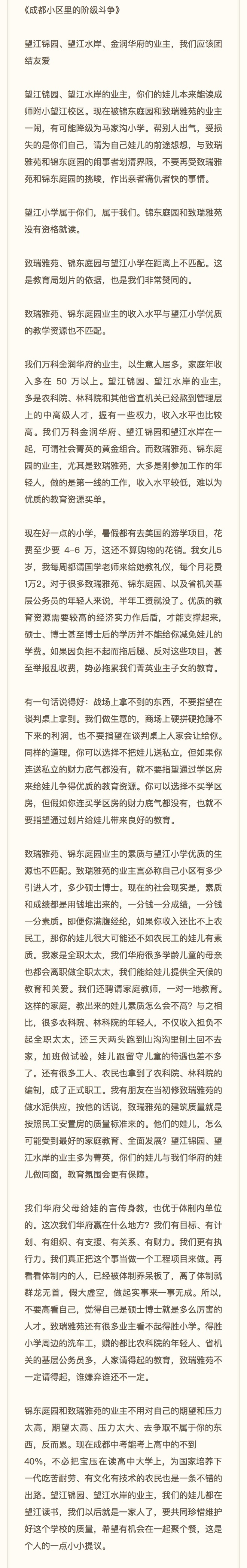 这封写给望江锦园、望江水岸、金润华府业主的公开信,号召这三个小区的业主团结友爱地把锦东庭园、致瑞雅苑两个低收入业主小区踢出对成都师范大学附属小学望江校区的争夺,这种因为教育资源稀缺引发的争夺战很容易触发每个人的神经,尤其对于那些天天喊着不能让孩子输在起跑线的家长们,更是如此。
