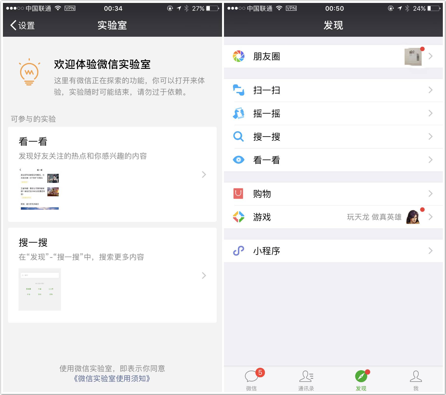 一直在增加功能方面保持谨慎态度的微信,在月活用户达到9.38亿时迈出了重要一步——接近5月18日凌晨时,微信 iOS 版更新了 6.5.8 版本,本次更新的最引入注目的部分是具备搜索功能的「微信实验室」,进入“微信实验室”可以看见新上线“搜一搜”、“看一看”入口。