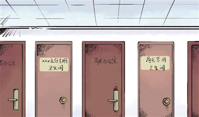 日前,据网友爆料,“江西省上饶市余干县国土局新大楼‘高大上’,洗手间、接待室多得吓人。”据悉,该局12名领导的办公室门口都设有单独洗手间和接待室。对此余干县纪委回应称,八项规定后该局把原来领导的套房办公室进行了拆分,洗手间和接待室独立出去,“办公室使用面积不超标”。(5月17日北京时间)漫画/勾犇