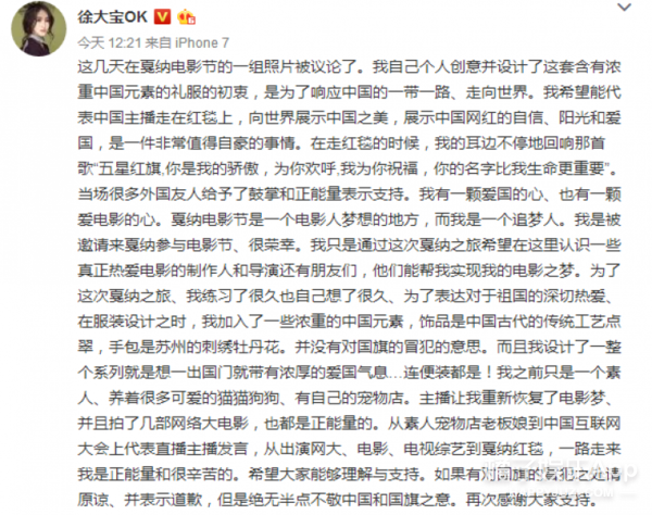 中午时候,网红在微博上回应了,说自己希望代表中国主播走在红毯上,向世界展示中国之美,展示中国网红的自信......还说这件服装是自己设计的,如有对国旗的冒犯之处请原谅。