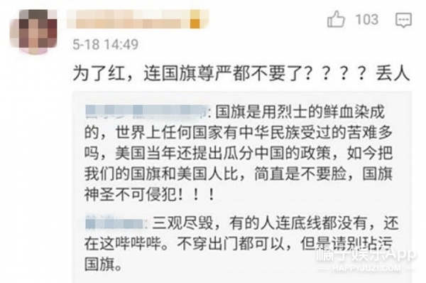 果然照片一出来就在网上引起了热议,大家都一边倒的批评这个网红,说她侵犯了国旗法、侮辱国旗。