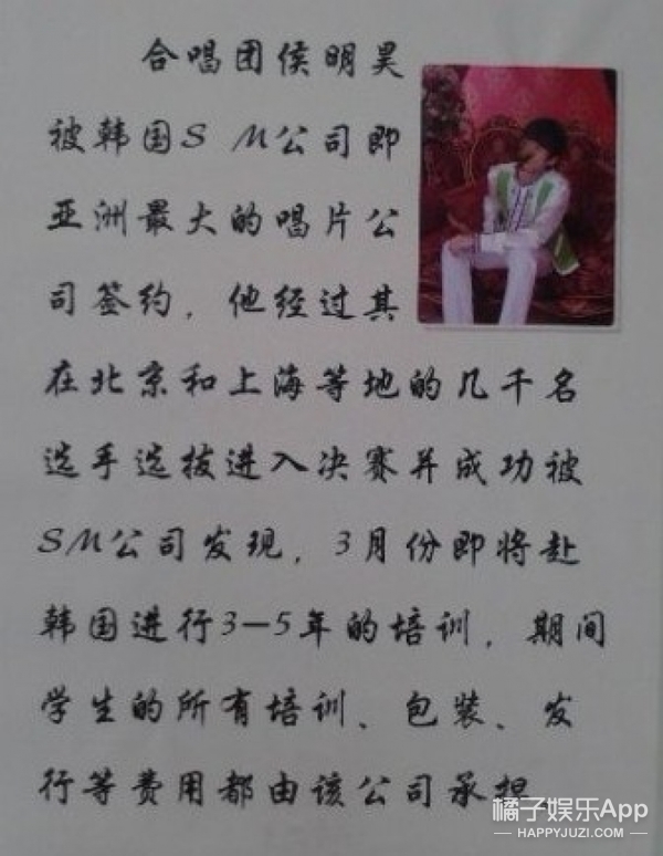 所以,高中参加SM公司在中国的选秀比赛时,成功入选成为练习生,之后学校里还张贴了他的海报,感觉蛮自豪的。