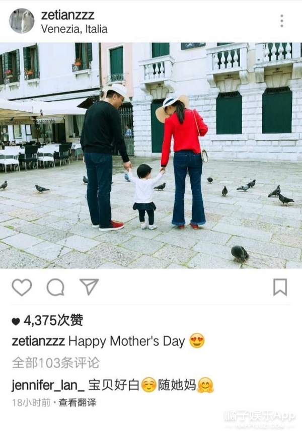 比如前段时间母亲节,她晒了张一家三口出游的照片,配文“Happy Mother's Day”!