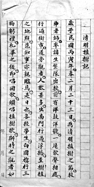 岁于民国丙寅年,春二月二十三日,为清明植树之节。校中老师,率诸生整队出校,前有洋鼓洋号,一片歌声相随。行过街市,道旁观者,人数甚多。出南门行过浮桥,至植树之地点,范知事亦亲临焉。是日也,各校学生,向国旗行三鞠躬礼,礼毕之后,即唱国歌,继唱植树歌。斯时之观者如堵墙。是植树洵国家之大典,予于回后,遂为之记。