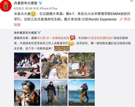 4月24日丹麦驻华大使馆的一篇微博《生蚝长满海岸,丹麦人却一点高兴不起来》迅速走红网络,“丹麦生蚝”仿佛一夜之间变得家喻户晓,生蚝事件明显成为丹麦农产品及旅游业打开中国市场的敲门砖。