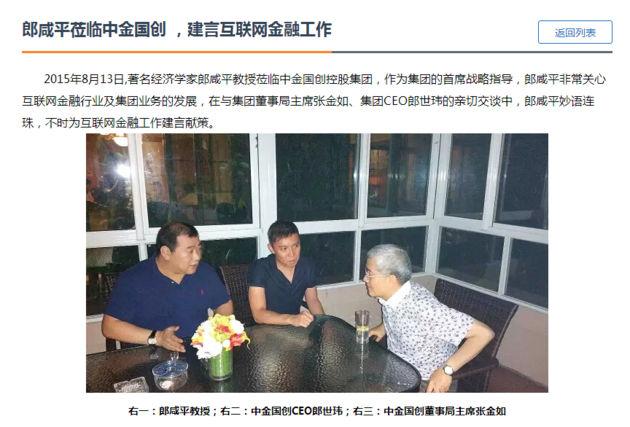 在合拍贷网站上刊登的一篇文中,则称郎咸平在2015年8月13日来到中金国创,与集团董事局主席张金如、集团CEO郎世玮交谈。