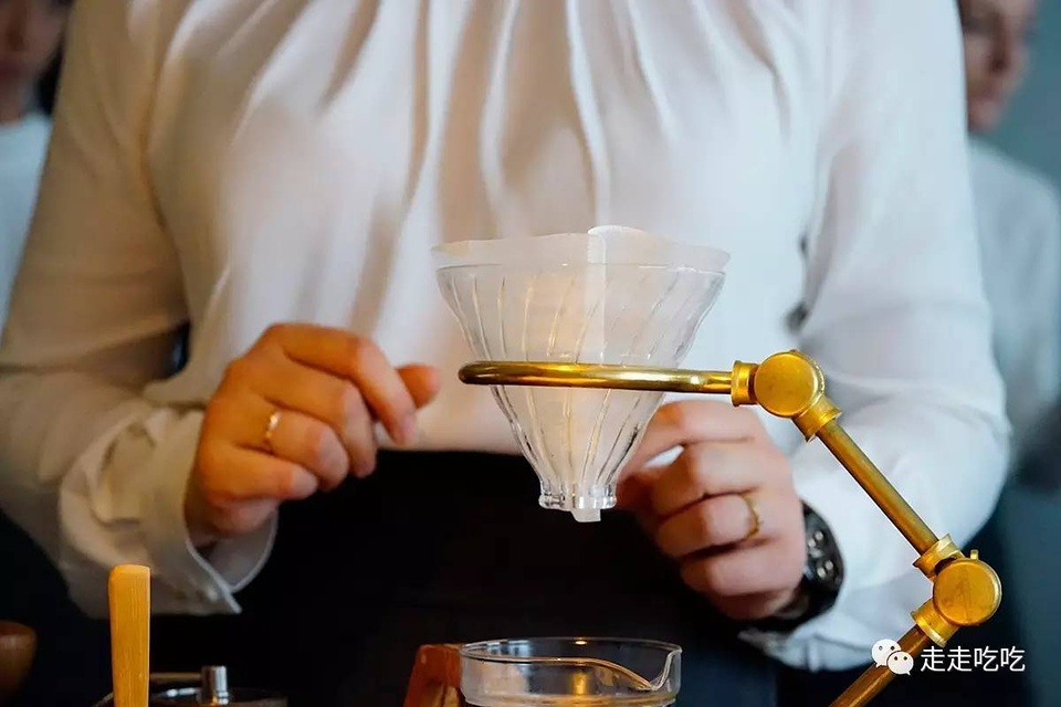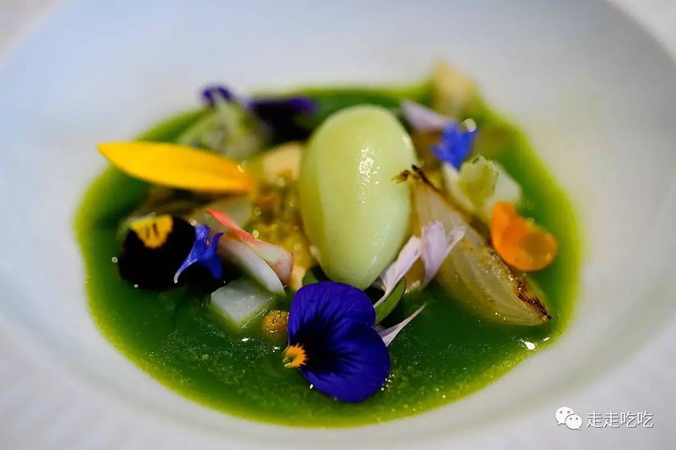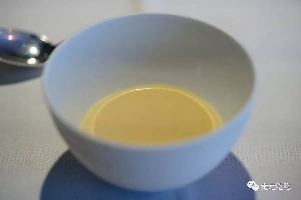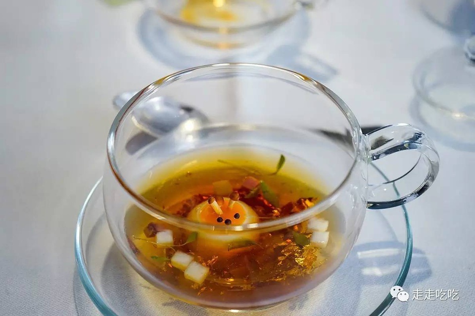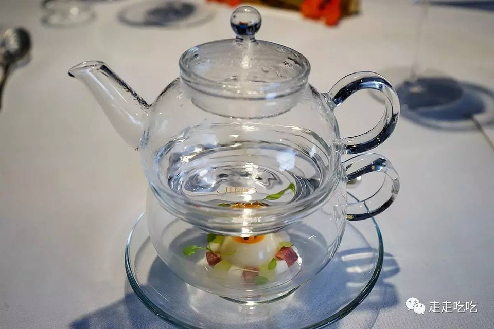 第二部分由一杯左右温度不同的“冷热茶”开始,这是主厨早年非常出名的一道菜品。看似平凡的一个杯子里,茶从中间被分割成了冷热两个部分,而且两者相安无事,并未出现混合。喝的时候可以明显感觉到温差,虽然是以伯爵茶为底,但透出淡淡的梨香。这其中的奥妙在于一种叫结冷胶F(Gellan F)的果冻制剂,一冷一热两边的茶其实都是弱凝胶状态,好比很薄的羹,并不让人觉得是胶状的。